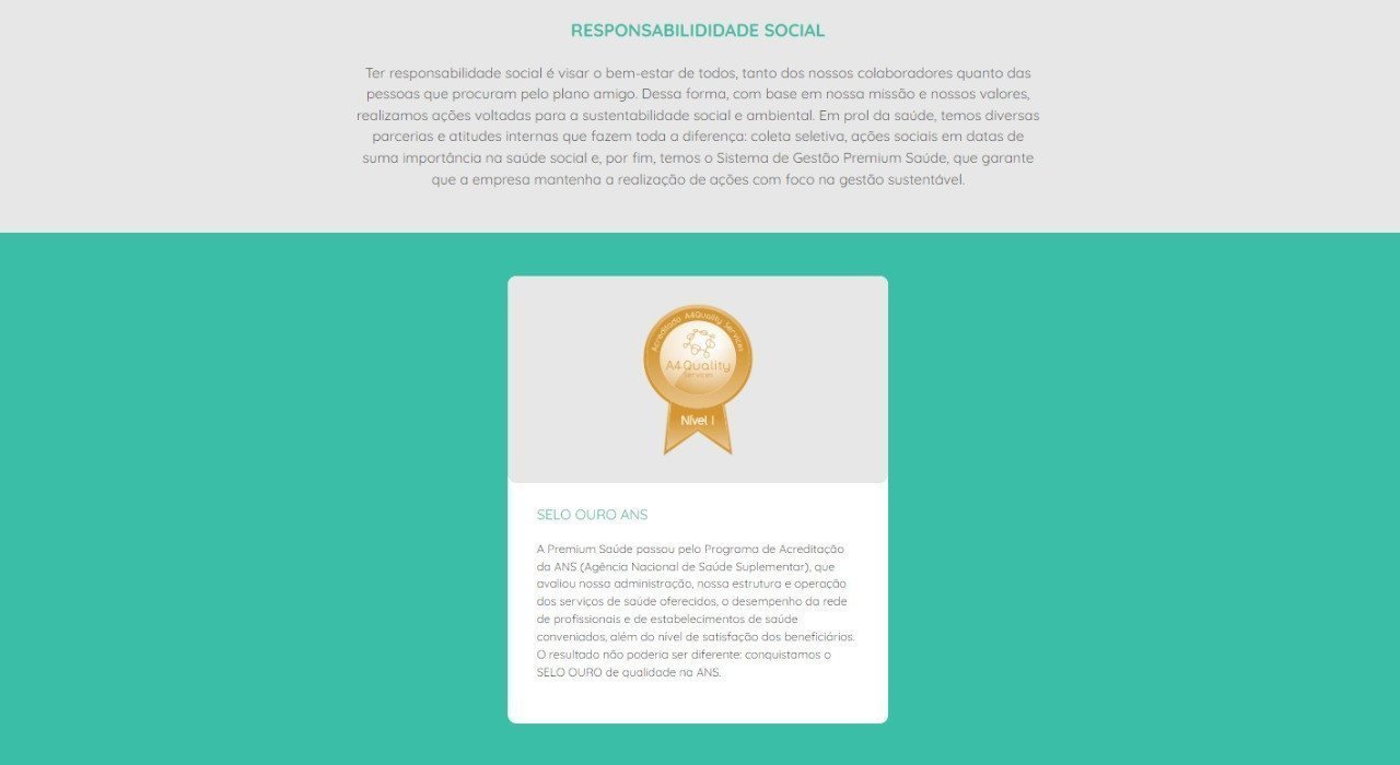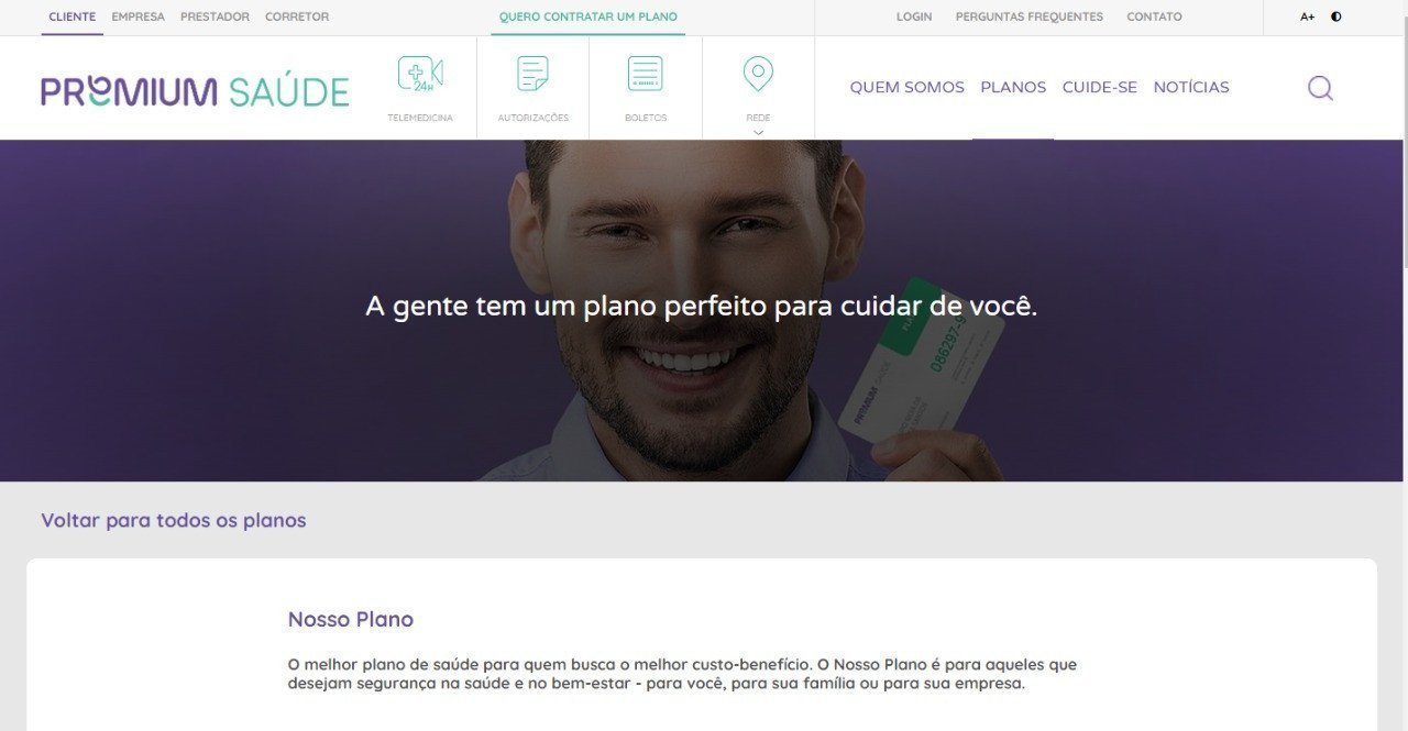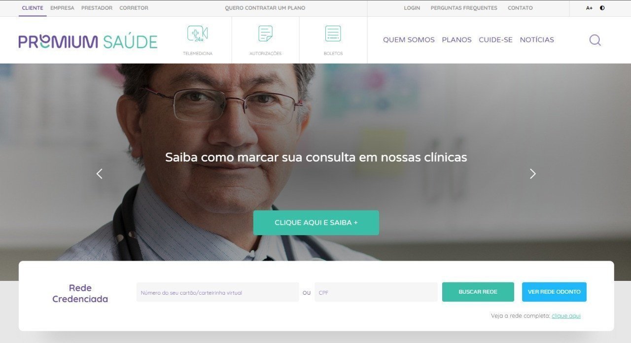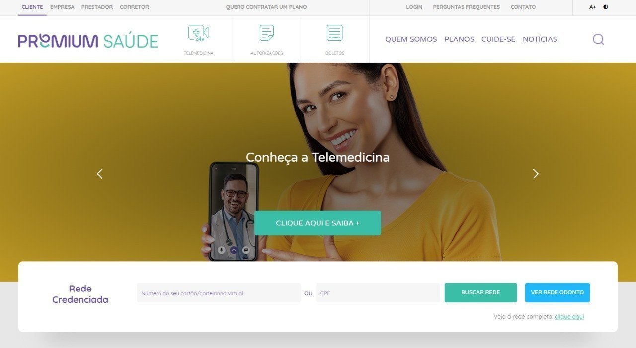 Premium Saúde is a company that provides Health Plans, integrating, since 2011, the most advanced medical and dental treatment. In order to organize and support the patient, the site offers means to facilitate diagnoses, such as telemedicine functionality. The Premium Saúde website, in addition to having plans aimed at small and large companies, also offers plans for individuals.